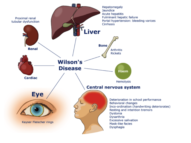 Det ophobede kobber ødelægger efterhånden levercellerne og føres med blodet til andre organer. Kobberet aflejres i hjernen et bestemt sted (basalganglierne), hvor det kan give anledning til forskellige neurologiske symptomer. Der aflejres også kobber i øjets hornhinde. Kobberet danner, hos nogle, en rustrød ring i kanten, den såkaldte Kayser-Fleischer ring.